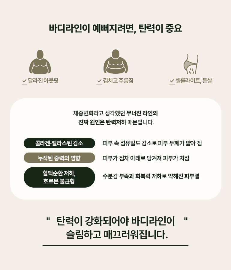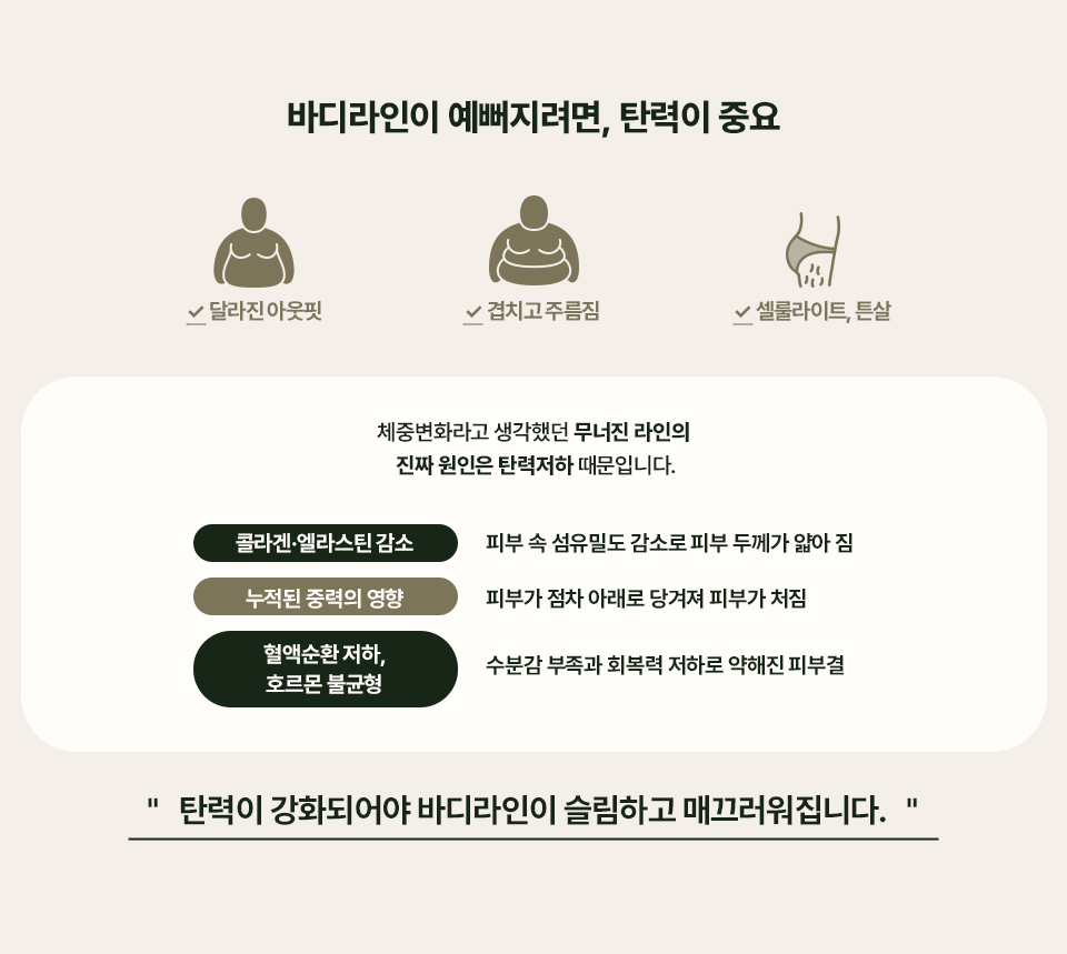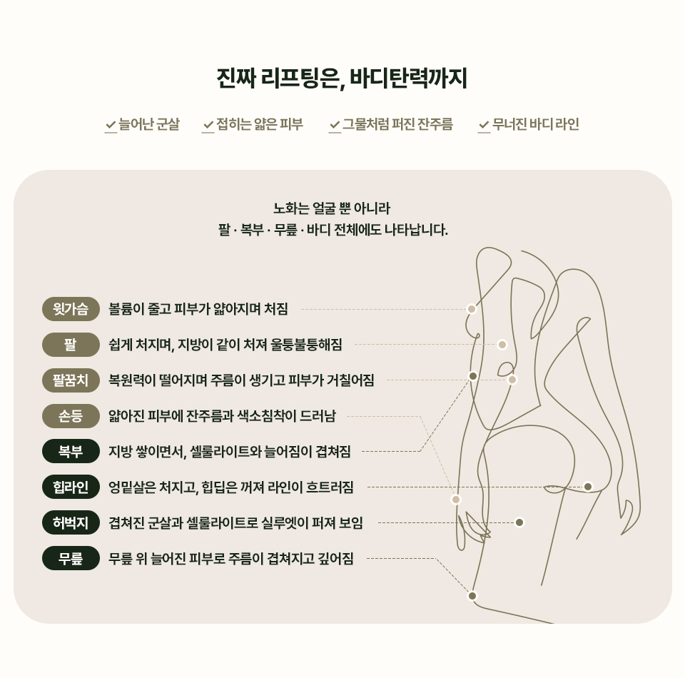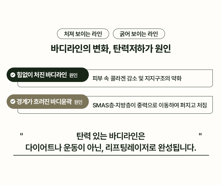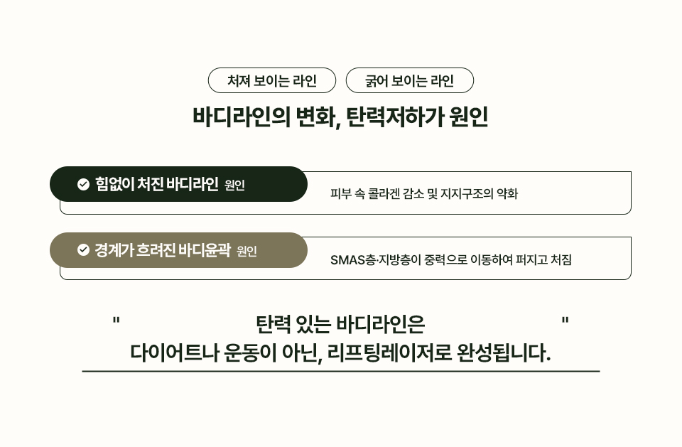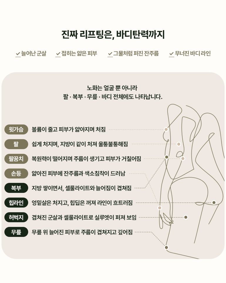 탄력을 잃은 무너진 바디라인, 리프팅이 필요합니다.
